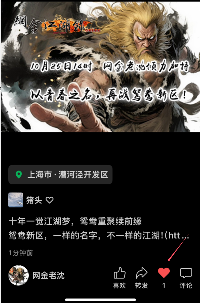 2、打开【网金老沈】视频号,点开“網金江湖録鸳鸯新区”视频,将右下角小红心点亮,手机全屏截图发给客服即可获得申请“点赞好礼”的权限。